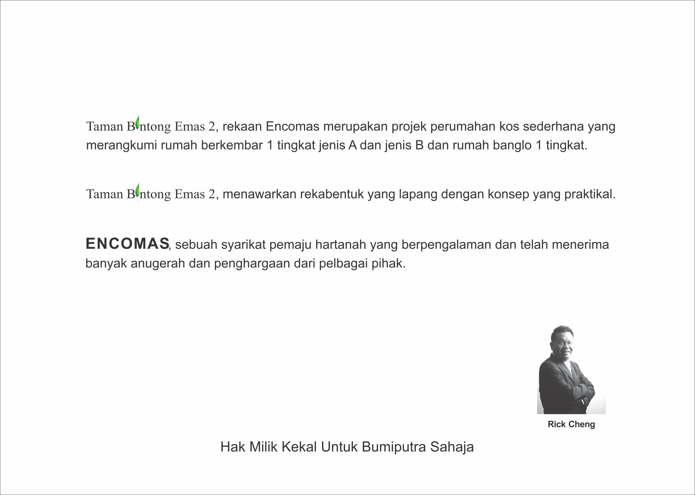 Taman Bintopng Emas 2, rekaan ENCOMAS merupakan projek perumahan kos sederhana yang merangkumi rumahberkembar 1 tingkat jenis A dan jenis B dan rumah banglo 1 tingkat.