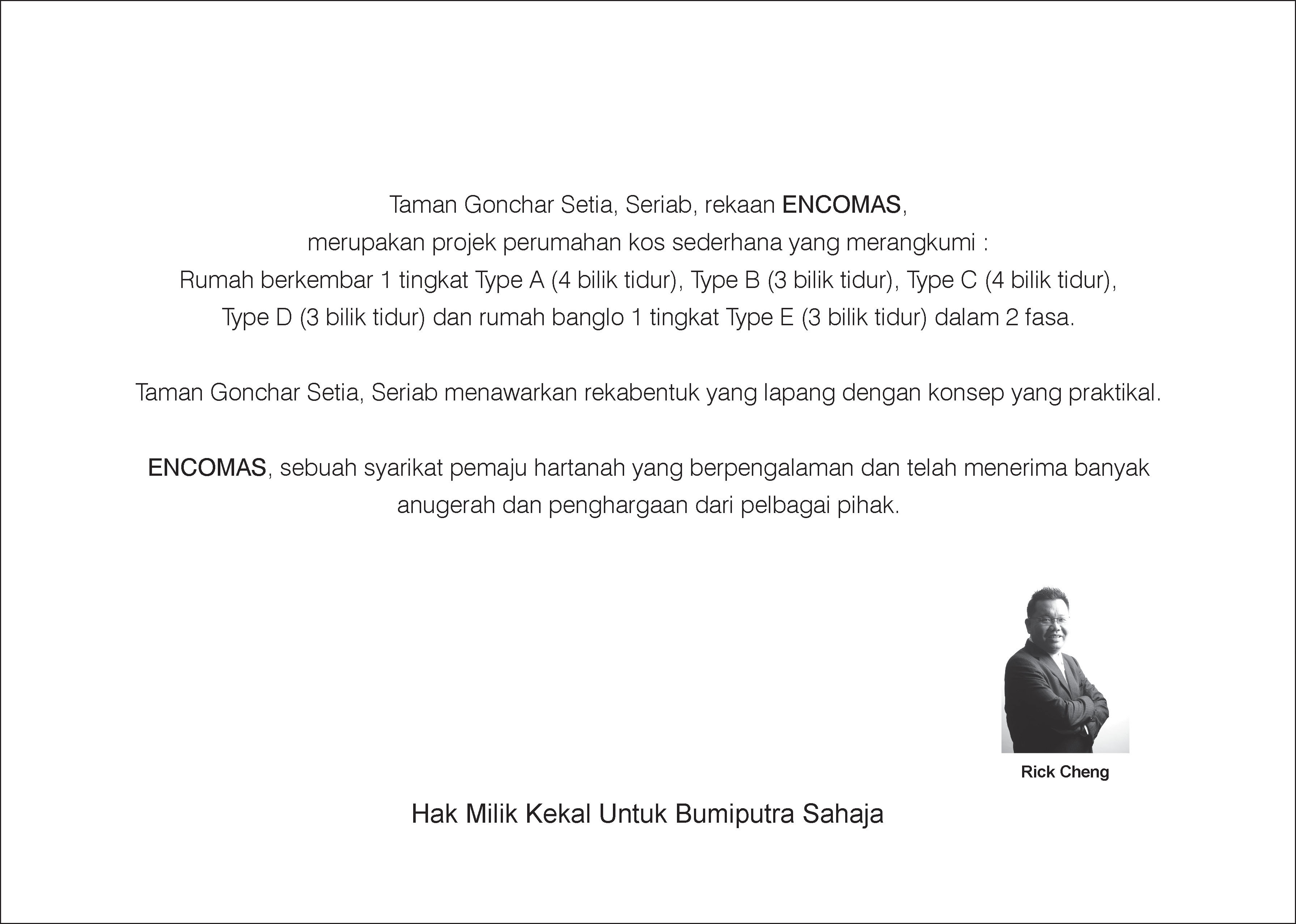 Taman Gonchar Setia, Seriab, rekaan ENCOMAS, merupakan projek perumahan kos sederhana yang merangkumi: Rumah berkembar 1 tingkat Type A (4 bilik tidur), Type B (3 bilik tidur), Type C (4 bilik tidur), Type D (3 bilik tidur) dan rumah banglo 1 tingkat Type E (3 bilik tidur) dalam 2 fasa, Taman Gonchar Setia, Seriab menawarkan rekabentuk yang lapang dengan konsep yang praktikal.