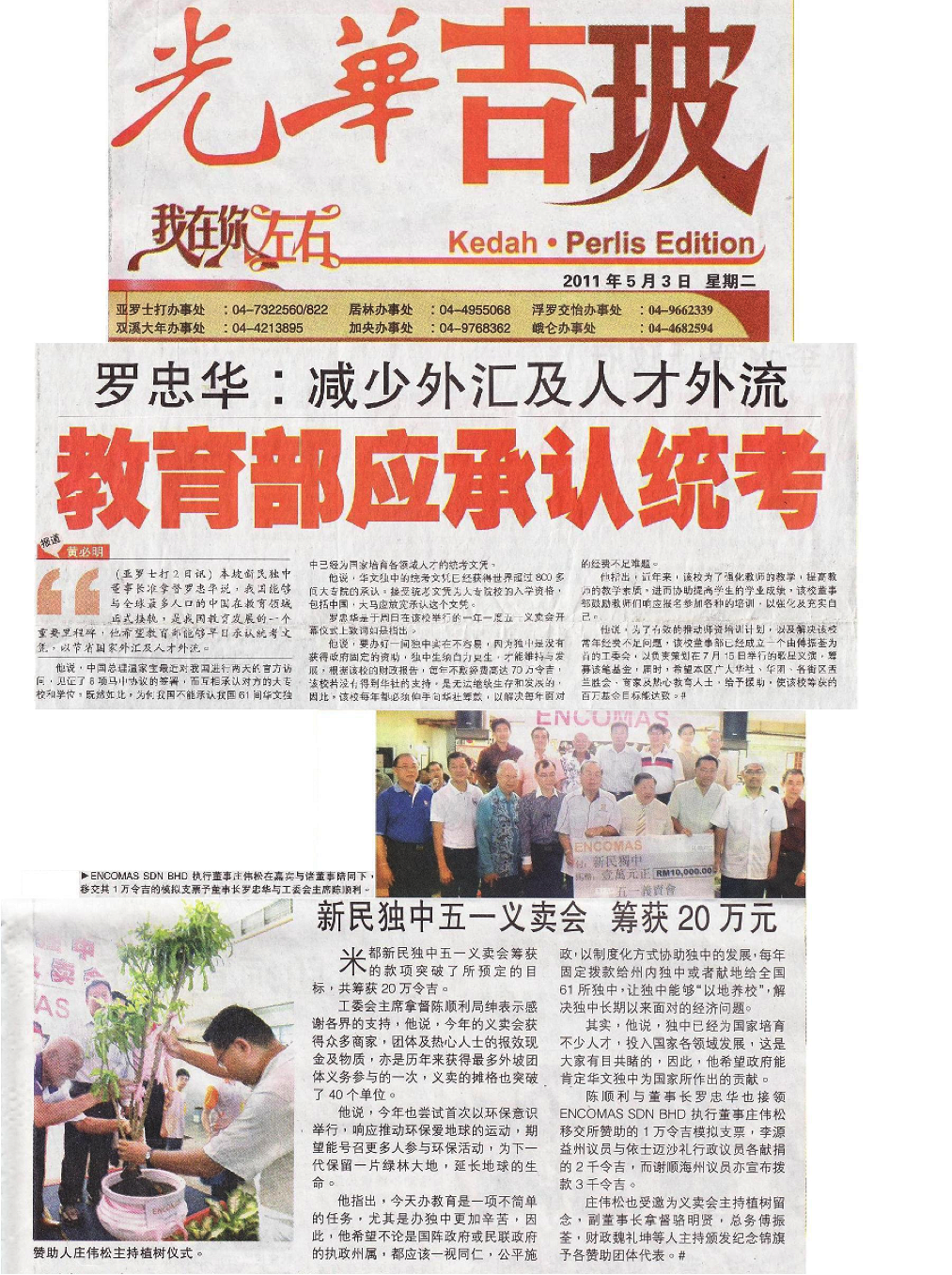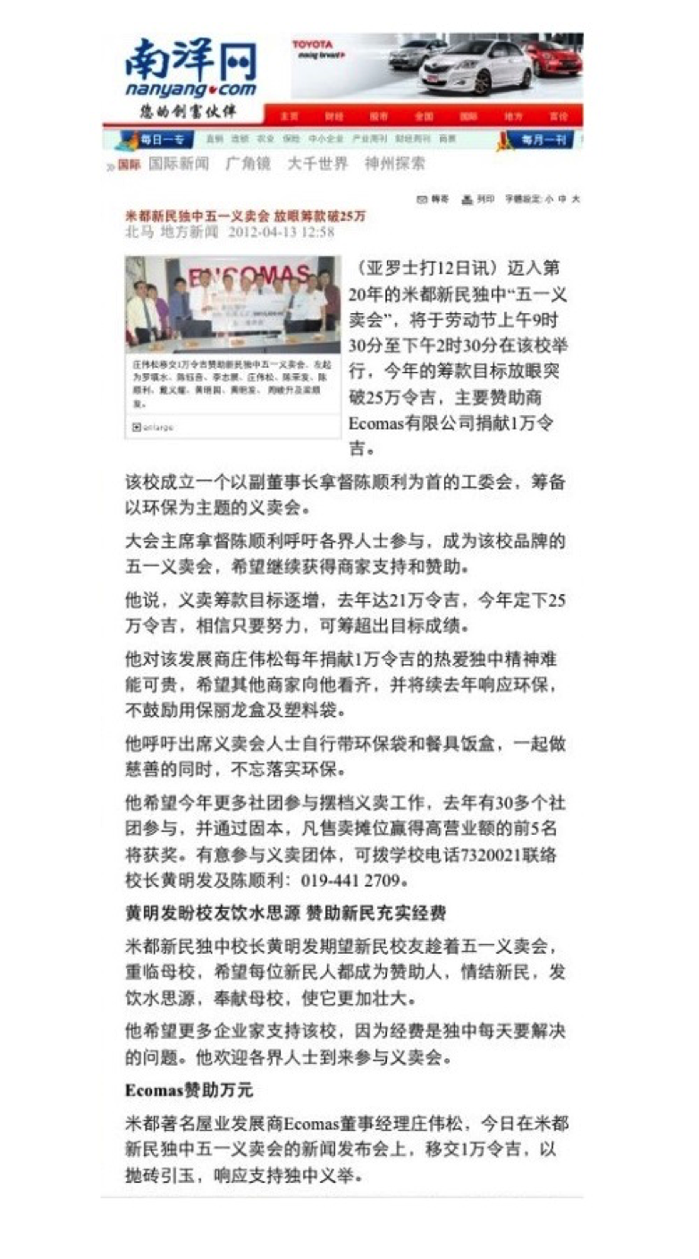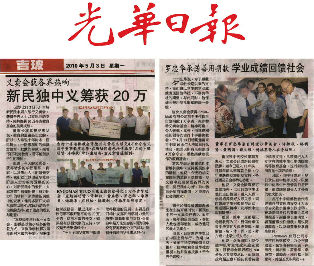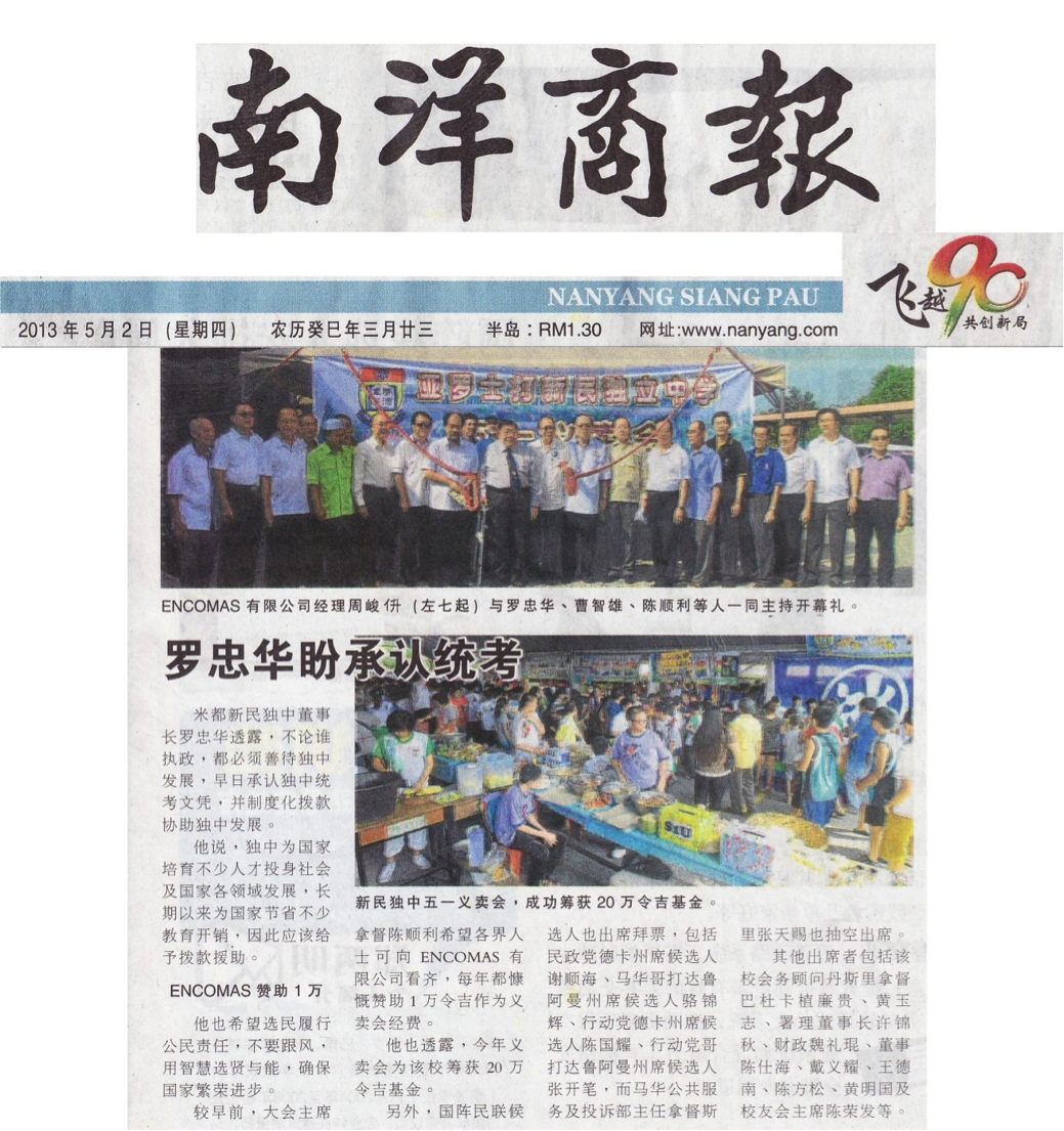 Encomas is very proud to sponsor the Charity Sales to raise fund for Sin Min Private School in Alor Setar since 2010. With the teamwork and generosity from the students, parents, local societies and many organizations, the charity manage to raise on average RM250,000.00 for the Sin Min Private School Fund.